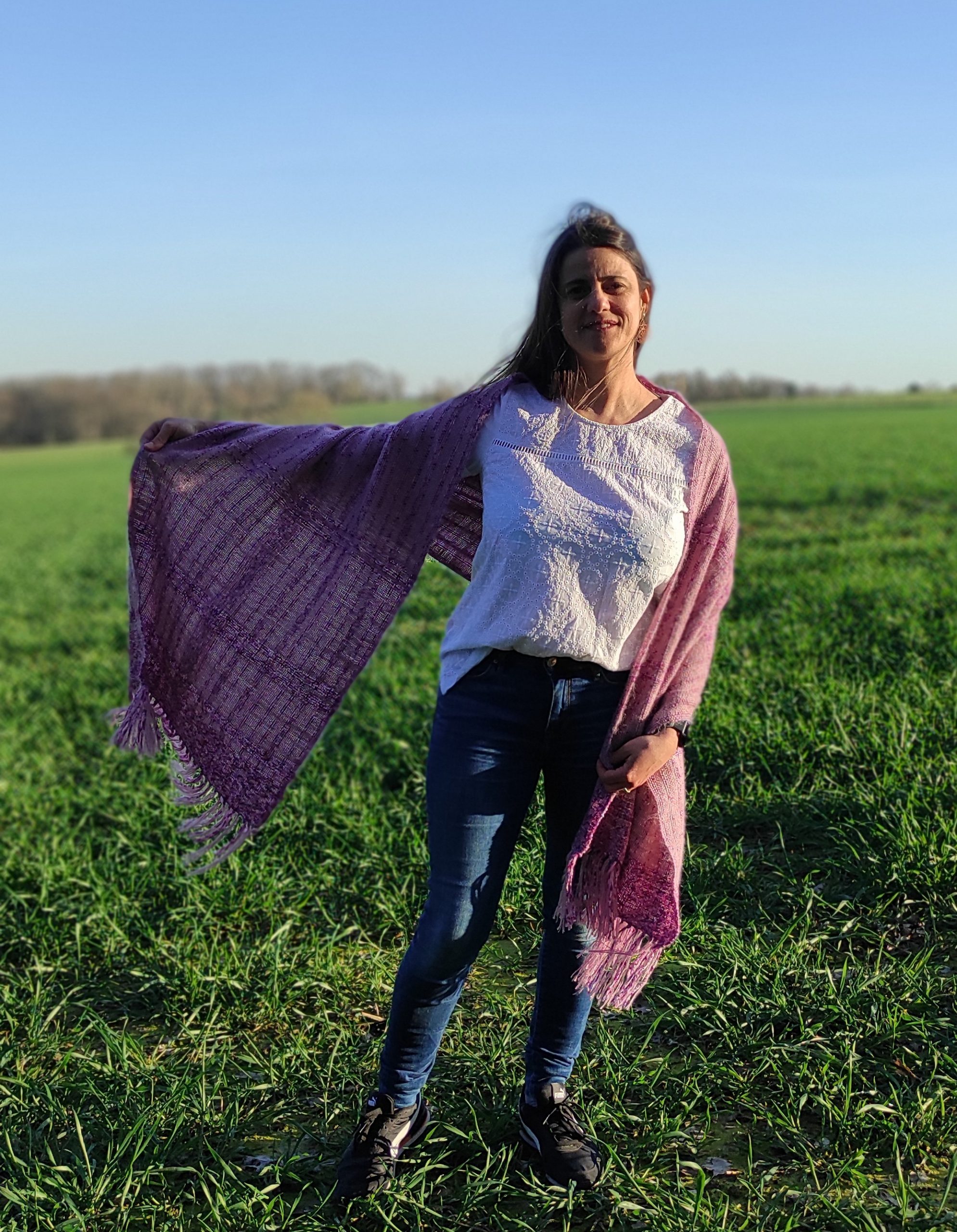 Echarpe o chal de lana con seda y moahir en tonos rosa y lila. Es un precioso echarpe que sirve para toda ocación, por su delicadeza y exquisita caída, es muy agradable de usar. Tiene colores suaves, pero a la misma vez vistosos. Se logró un juego de texturas que lo hace interesante. Esta tejido en telar de peine con tres lanas diferentes: una es de oveja 100% de Islandia, la otra es una mezcla compuesta por un 80% la lana de oveja de Falkland y un 20 % seda mulberry y por último una mezcla compuesta por un 70% mohair y un 30% mulberry.